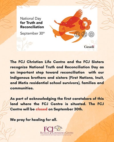 September 30 is National Day of Truth and Reconciliation. At the FCJ Christian Life Centre, the FCJ Centre staff and the FCJ Sisters recognize National Truth and Reconciliation Day as an important step toward reconciliation with our Indigenous brothers and sisters, their families, and communities. We wish to acknowledge the first caretakers of this land where the FCJ Centre is situated, and we pray for healing for all.